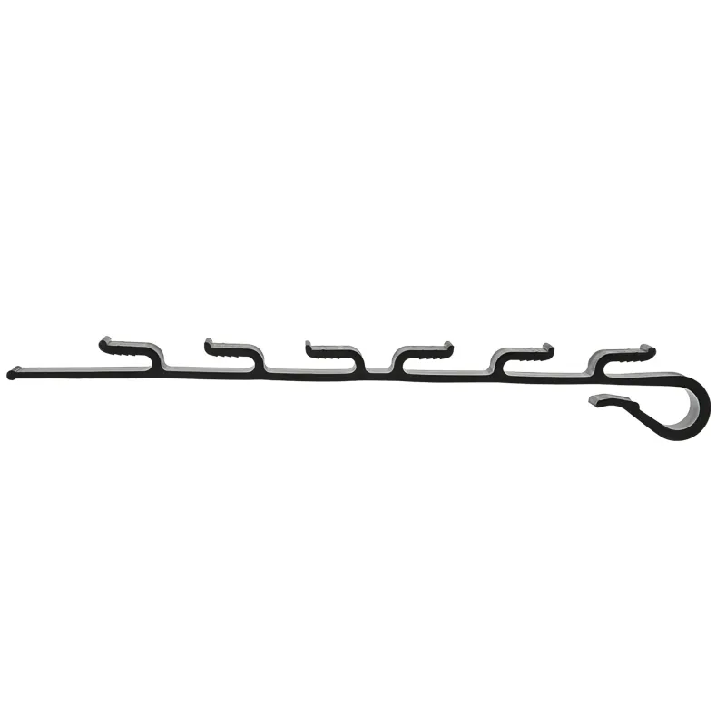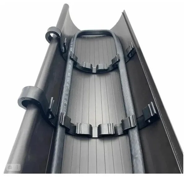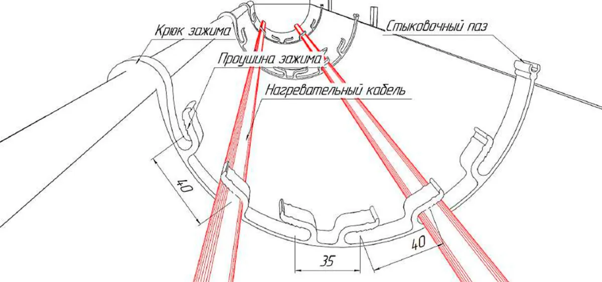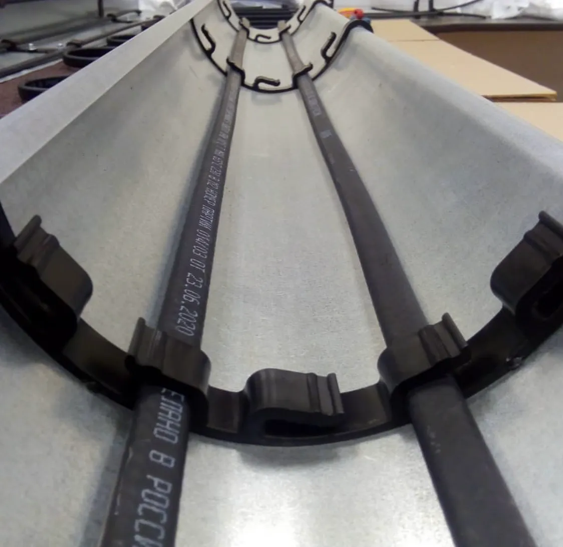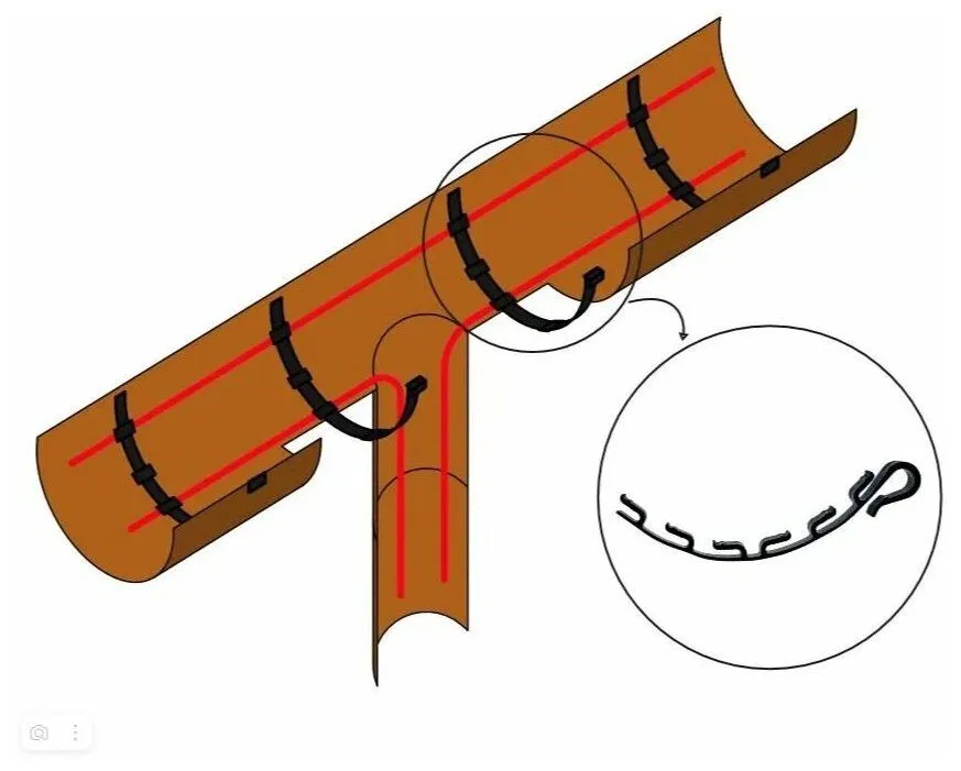 2. Фиксация нагревательного кабеля в специальные проушины. Зажим имеет шесть проушин, а так же крюк, который позволяет фиксировать зажим в водосточном желобе. Зажим предназначен для установки в желоба разного диаметра, однако, если диаметр желоба менее 180 мм, перед установкой необходимо провести примерку зажима и отделить лишнюю часть зажима. Зажим RX/В1-6 имеет стыковочный паз, позволяющий соединять разные виды зажимов RX. Проушины зажима RX/В1-6 позволяют закрепить и равномерно распределить в желобе до шести «ниток» нагревательного кабеля. Основным назначением зажима является равномерное распределение нагревательного кабеля в водосточном желобе, предотвращающее пересечение «ниток» греющего кабеля между собой, однако и функция крепления кабеля тоже присутствует, её показатель