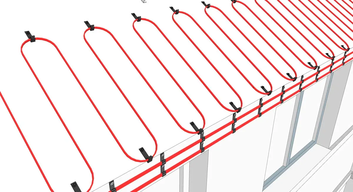 Зажим подходит для крепления большинства саморегулируемых и резистивных кабелей. Монтаж нагревательного кабеля делится на два этапа:
