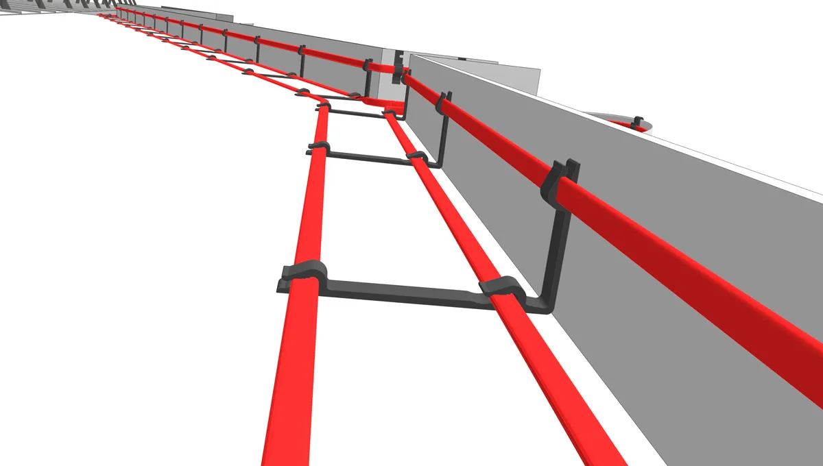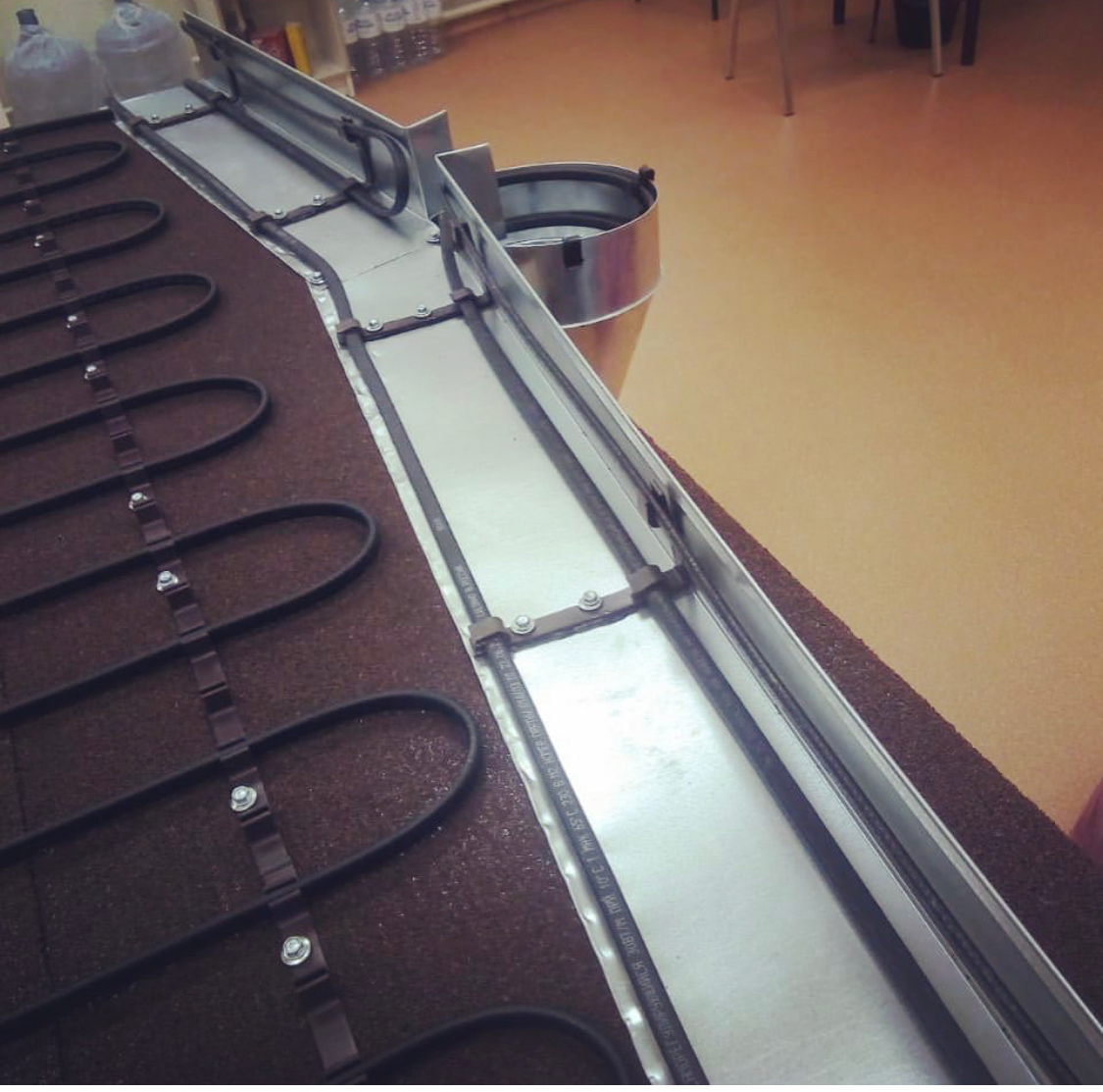 прокладывают по всей длине водосборных лотков нагревательный кабель от двух «ниток». Крепление нагревательного кабеля в водосборном лотке производится с использованием