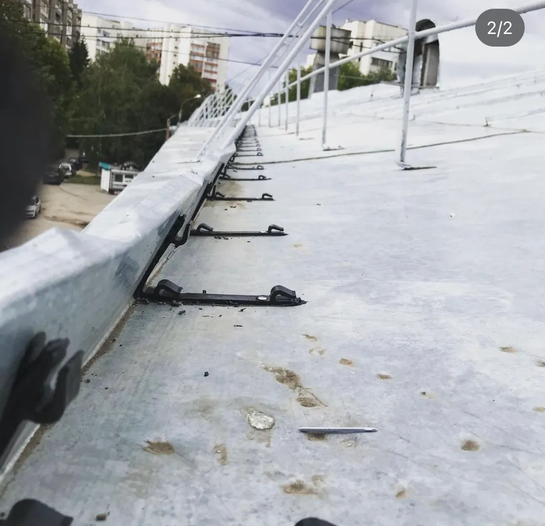 Зажим можно закрепить двумя методами. Первый: сквозная фиксации зажима на кровельном покрытии с использованием кровельного самореза, заклепок и т.д. Второй: с помощью приклеивания зажима специальным клеем. Данный способ менее надежный, чем сквозная фиксация, но он позволяет исключить возможность протечки воды через отверстия от саморезов.