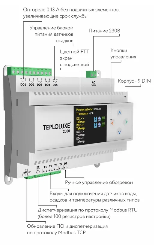 Контроллер Teploluxe 2000 используется для управления системами антиобледенения кровли и открытых площадок, обогрева трубопроводов и резервуаров, а также системами обогрева помещений (электрическими нагревательными кабелями, плёночными и другими электронагревателями)
