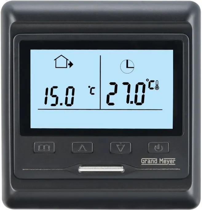 Сочетает в себе — простоту управления — всего 4 кнопки, надежность, качественное исполнение и красивый дизайн. В терморегуляторе Grand Meyer HW 800 два датчика температуры: датчик пола, датчик воздуха.