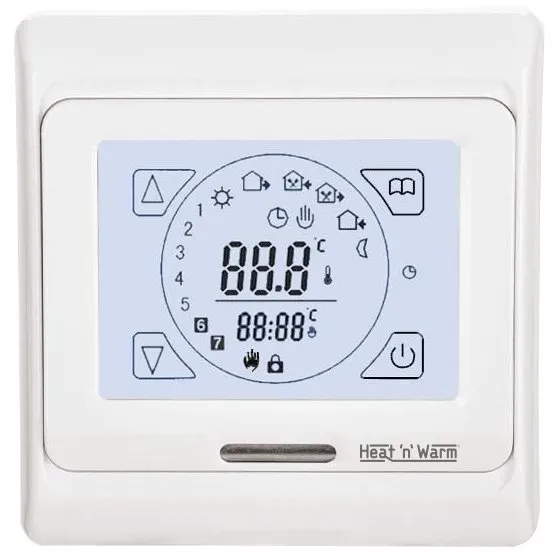 Grand Meyer HW700, программируемый терморегулятор c сенсорным дислпеем для управления отоплением электрического типа. Возможность программируемого а так же ручного управления. Возможность установки недельного периода 5+2/6+1/7 дней. Максимальная нагрузка 3600 W. Установка в стандартную монтажную коробку. Память настроек при отключении питания. Огнезащитный пластик. NTC датчик. Диапазон установки: от +5оС до +35оС (заводские)