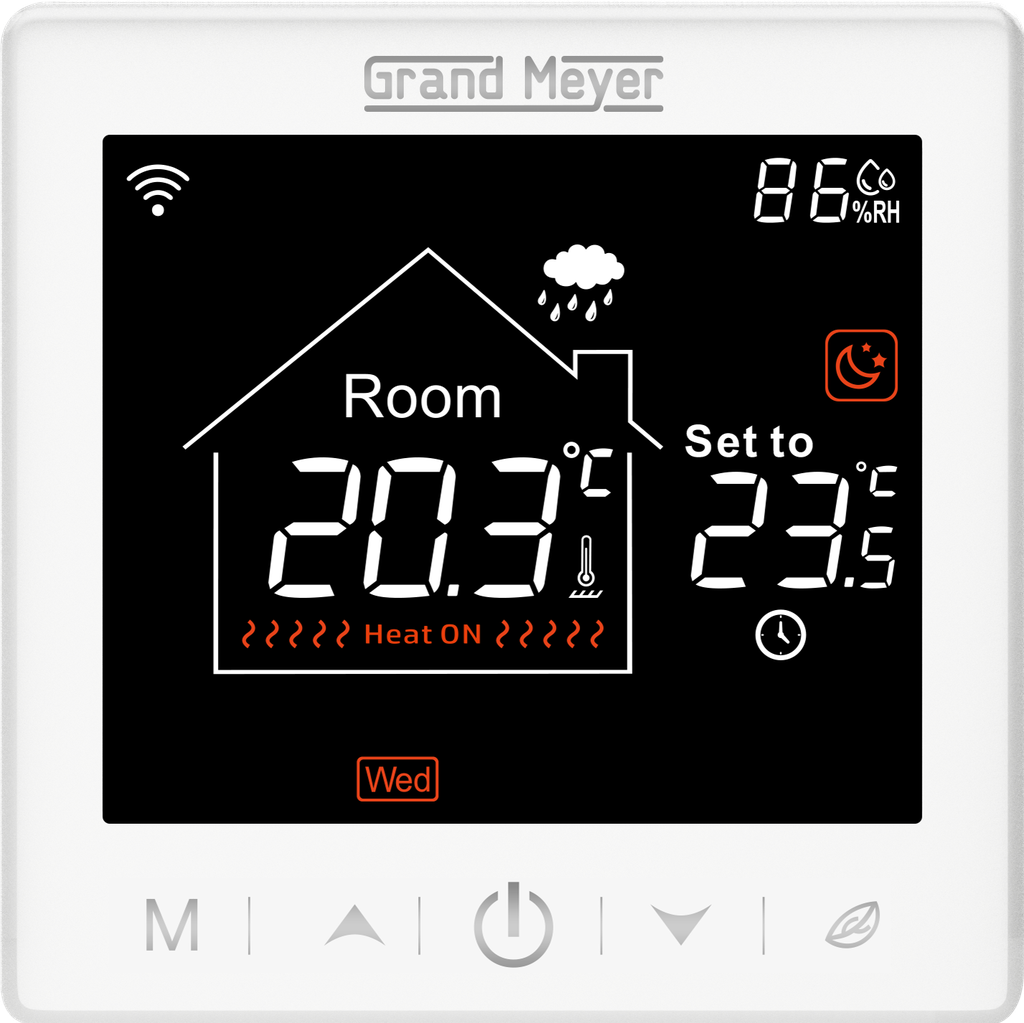 Сенсорный программируемый терморегулятор Grand Meyer SN-10 с функцией удаленного доступа по сети Wi-Fi для управления теплым полом. Терморегулятор автоматически поддерживает заданную температуру обогреваемой поверхности по показаниям датчика температуры пола (входит в комплект поставки) или по показаниям датчика температуры окружающего воздуха (встроен в регулятор), или в комбинации обоих датчиков. Имеет функцию прогноза погоды. Регулятор приспособлен для скрытого (утопленного) монтажа в гнезде стандартной монтажной коробки.