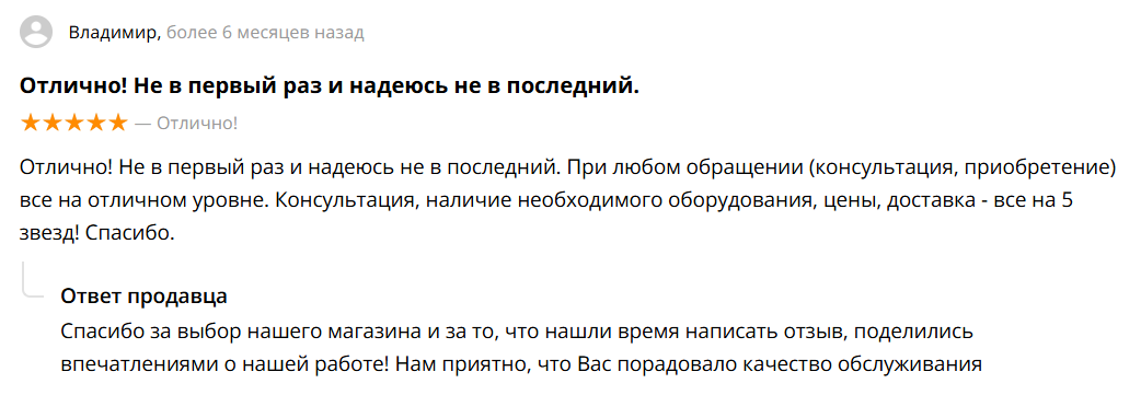 Отлично! Не в первый раз и надеюсь не в последний. При любом обращении (консультация, приобретение) все на отличном уровне. Консультация, наличие необходимого оборудования, цены, доставка - все на 5 звезд! Спасибо.