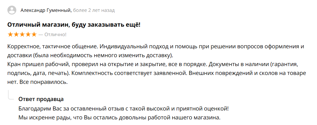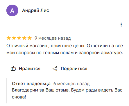 Отличный магазин , приятные цены. Ответили на все мои вопросы по теплым полам и запорной арматуре.