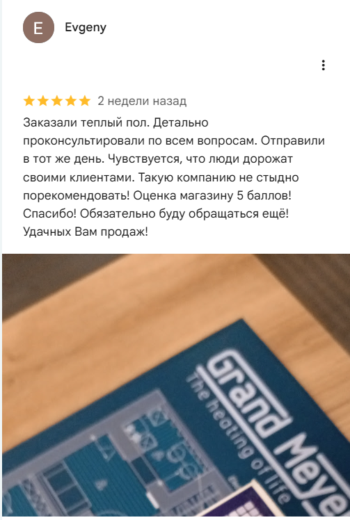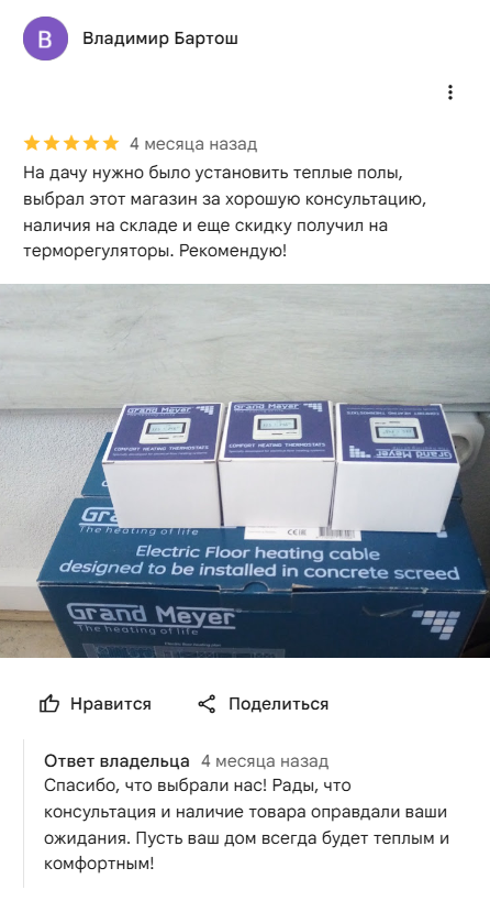 Очень понравилась консультация по телефону и то, что можно приехать и посмотреть вживую товар, покупали теплые полы и терморегуляторы Grand Meyer. Вернемся еще за системой защиты от протечек.