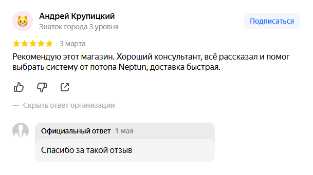 Рекомендую этот магазин. Хороший консультант, всё рассказал и помог выбрать систему от потопа Neptun, доставка быстрая.